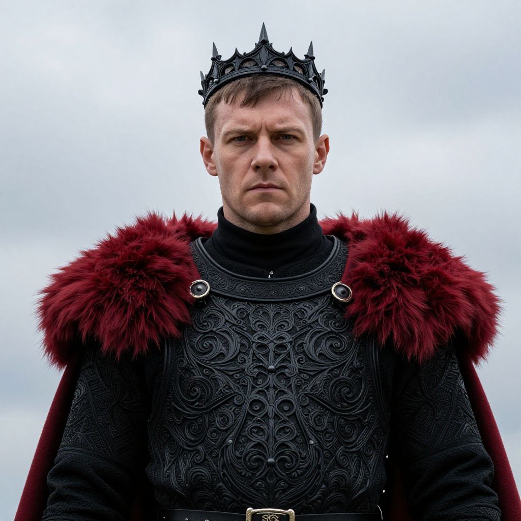 A man stands solemnly wearing an intricately detailed black medieval armor paired with a rich red fur cloak and a black crown. The dramatic overcast sky adds to the regal and intense atmosphere of this dark fantasy styled portrait.
