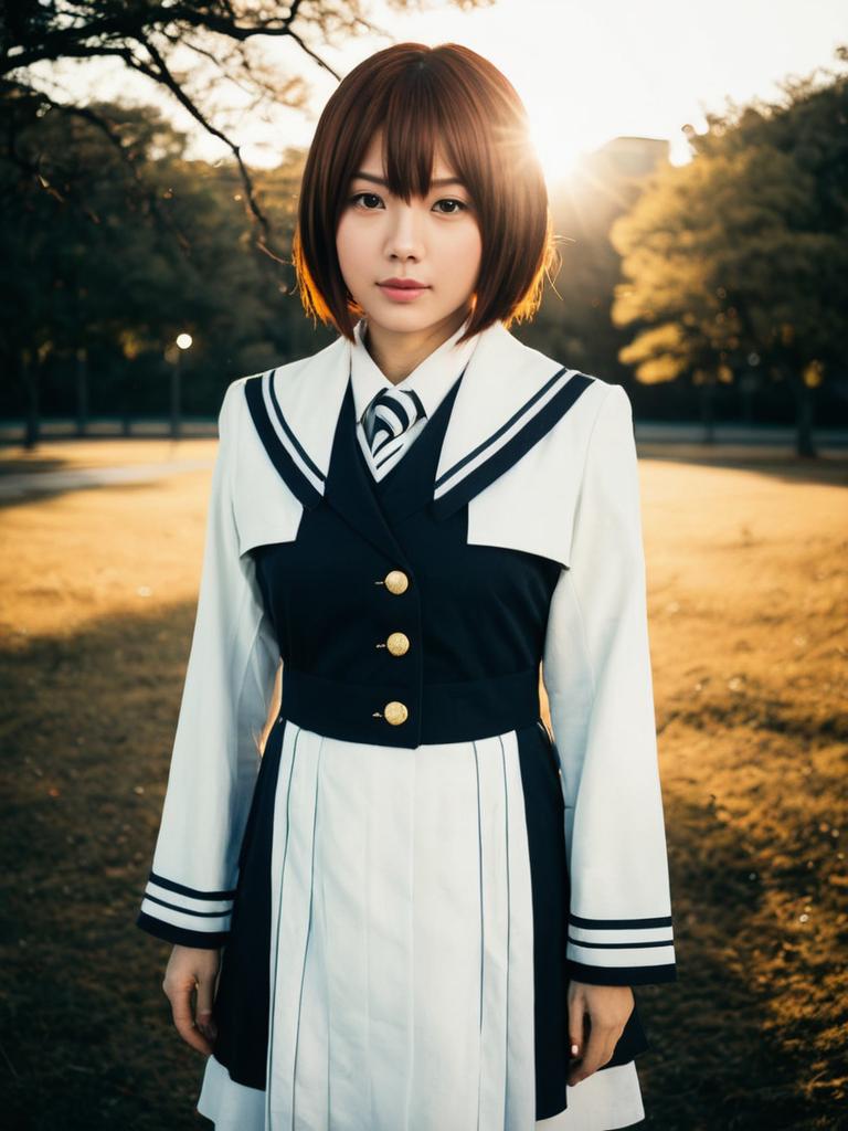 Realistic Cosplay Woman as Ui Hirasawa in Sailor Uniform Outdoors