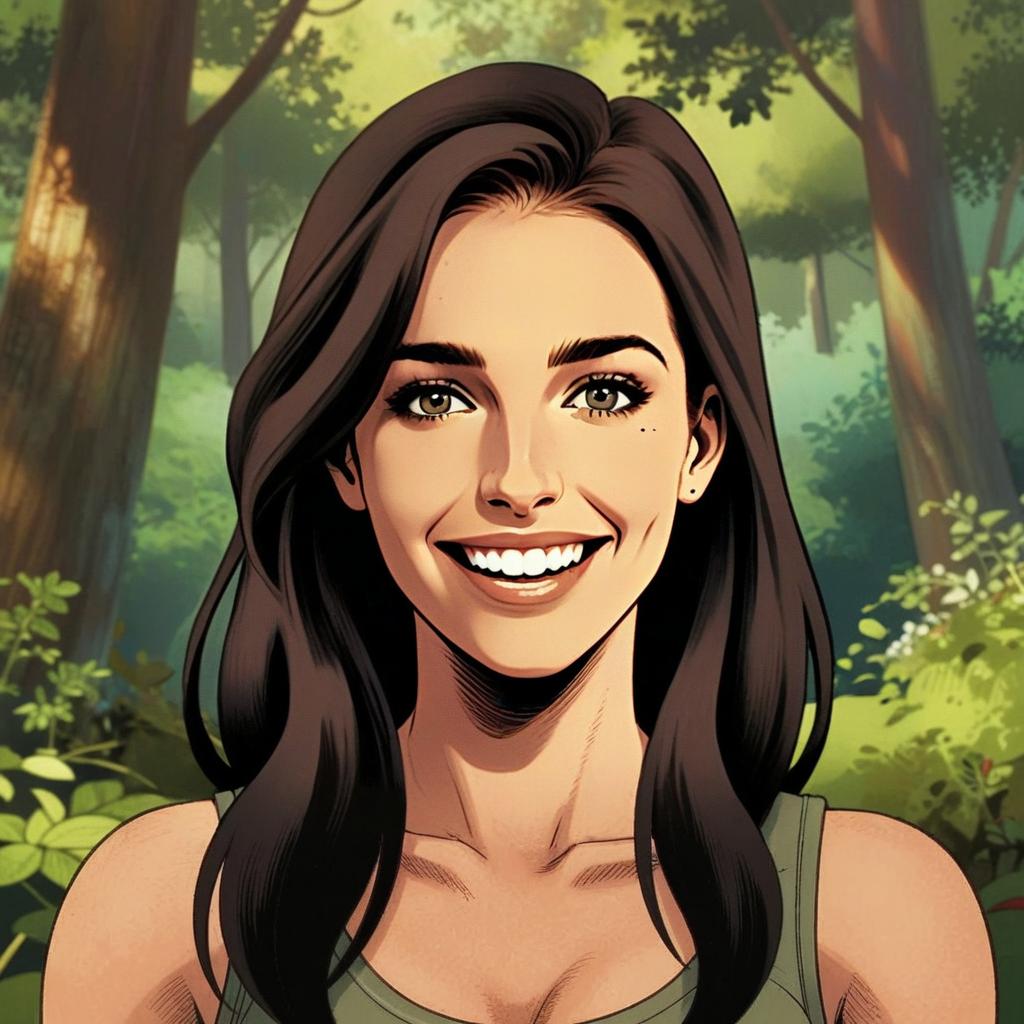 A digital illustration of a smiling young woman with long dark hair, set against a lush forest background. The artwork combines realistic facial features with a modern comic or graphic novel style, highlighting vibrant colors and fine line shading.