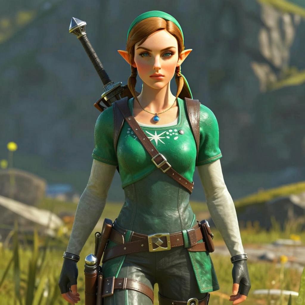 A confident young woman dressed in a green fantasy-style adventurer outfit, featuring pointed elf-like ears and intricate leather accessories. She carries a sword strapped to her back and stands in a natural outdoor setting, embodying a modern, high-quality 3D game character design reminiscent of popular fantasy RPGs.