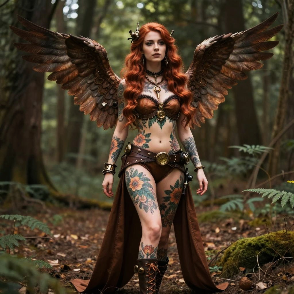 A striking woman with vibrant red hair poses in a mystical forest setting, adorned in steampunk-inspired attire with detailed floral tattoos covering her body. She features large, intricately crafted mechanical wings, blending fantasy and steampunk aesthetics in a powerful and enchanting composition.