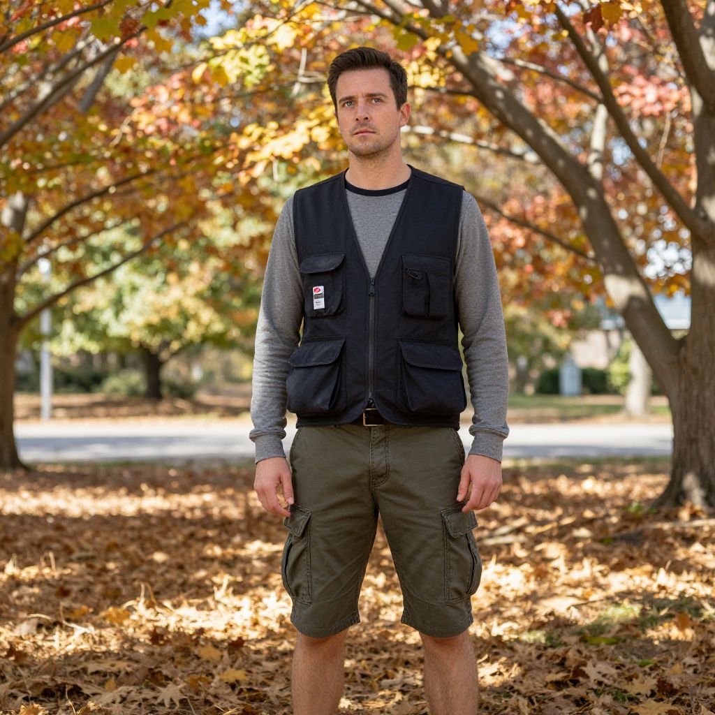 Man in Cargo Shorts and Utility Vest Standing in Autumn Park