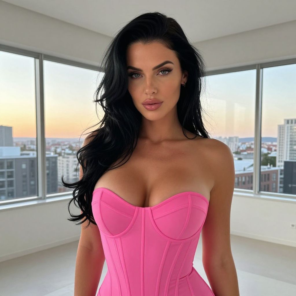 A confident woman with long black hair poses indoors wearing a form-fitting pink corset. Large windows behind her reveal a cityscape at sunset, adding a soft natural light to the modern minimalist interior.
