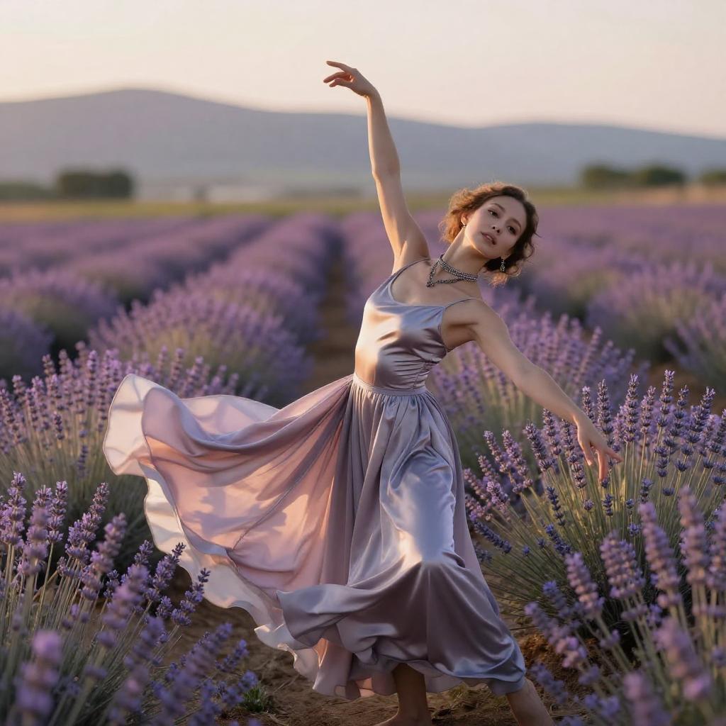 A graceful woman dances elegantly in a flowing lavender-colored dress amidst a vast lavender field during golden hour. The soft light enhances the serene and romantic atmosphere, highlighting the harmony between her movements and the natural beauty surrounding her.
