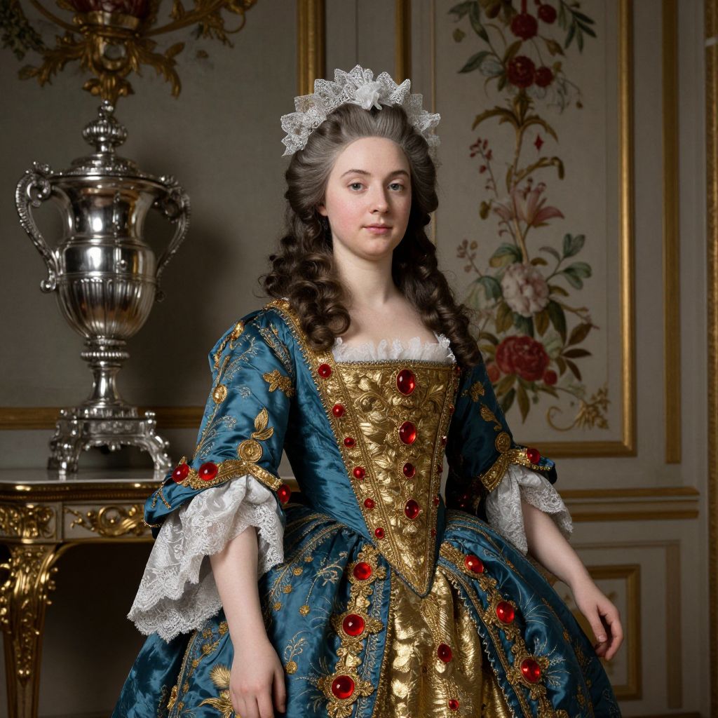 A young woman dressed in an elaborate 18th-century Rococo style gown featuring rich blue and gold fabric adorned with large red gemstones poses gracefully in an elegantly decorated room with floral wallpaper and ornate furniture. Her curly hair is styled with a lace headpiece, complementing the opulent and historical atmosphere of the portrait.