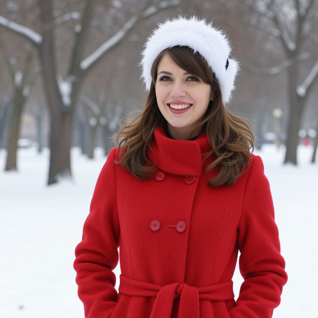 A smiling woman dressed in a bright red winter coat and a white fur hat stands outdoors in a snowy park. The background features bare trees and a soft-focus winter landscape, highlighting the contrasting colors of her outfit against the snowy setting.