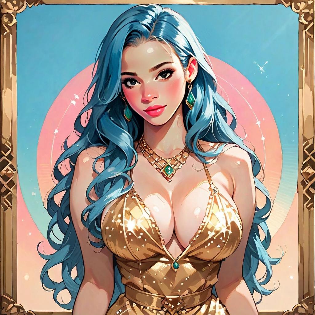 A digitally illustrated woman with long, flowing blue hair is depicted wearing a shimmering golden dress adorned with green gemstone jewelry. The artwork features a vibrant color palette with a soft pink and blue circular background, framed by ornate golden patterns, highlighting the character's confident and glamorous appearance. This portrait is rendered in a modern anime-inspired style, emphasizing detailed facial features and glossy textures.