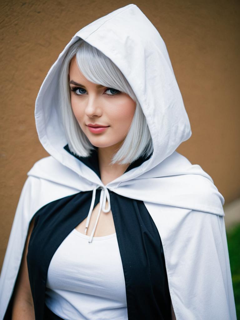 A woman with silver hair poses confidently wearing a white hooded cloak over a black and white outfit, creating a striking contrast. The image evokes a fantasy or cosplay style, highlighting the dramatic yet elegant costume design.