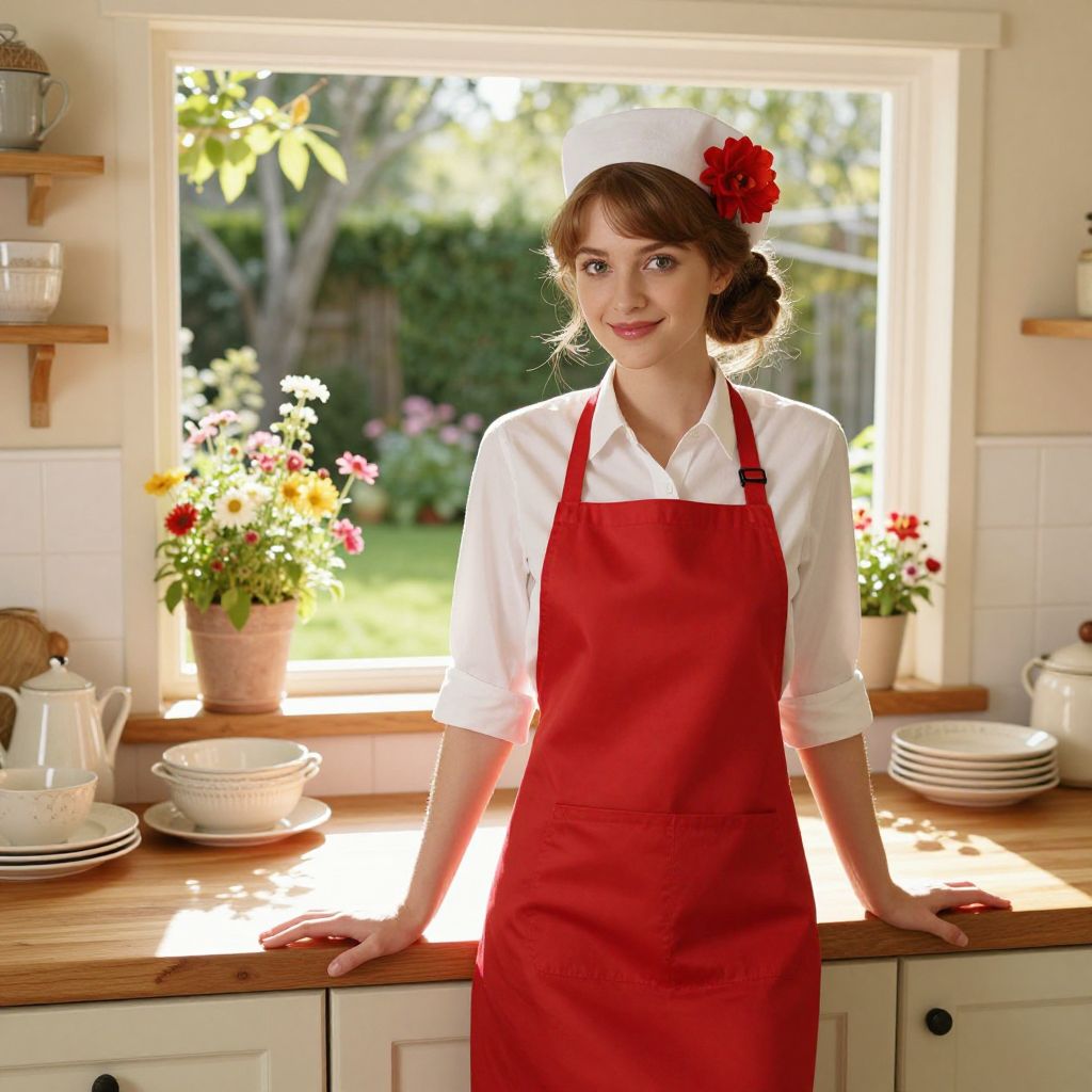 A young woman stands in a sunlit kitchen wearing a red apron and a white cap adorned with a red flower, exuding a cheerful and welcoming atmosphere. She leans on the wooden countertop, with colorful flowers visible through the window behind her, enhancing the cozy and bright setting.