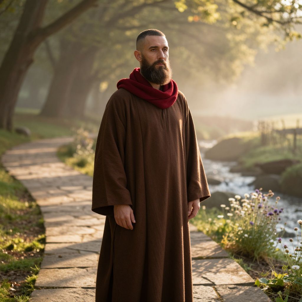 A contemplative man with a full beard stands on a stone pathway beside a serene creek, surrounded by lush greenery and soft morning light. He wears a long brown robe with a deep red scarf, evoking a monk-like or medieval style in a tranquil outdoor setting.