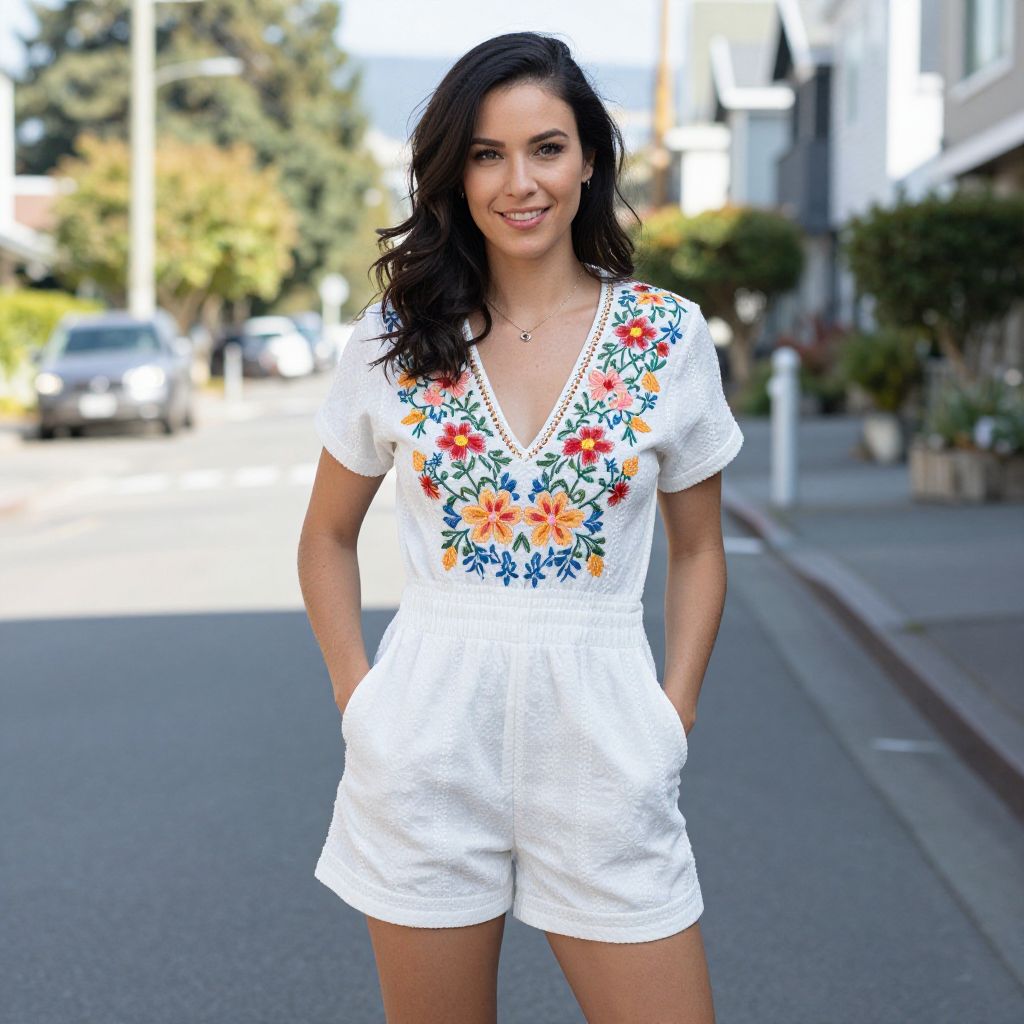A young woman stands confidently on a suburban street, wearing a white romper adorned with vibrant floral embroidery along the neckline. The casual yet stylish outfit complements her natural and cheerful expression, captured in soft natural lighting with a blurred background.