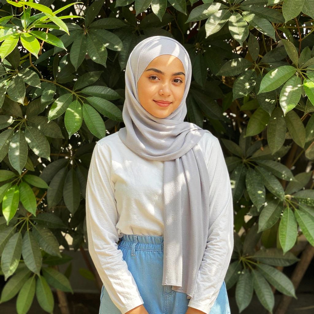A young woman wearing a light gray hijab and a white long-sleeve top stands gracefully in front of lush green foliage. The natural sunlight creates soft shadows, enhancing the serene and peaceful mood of the portrait.
