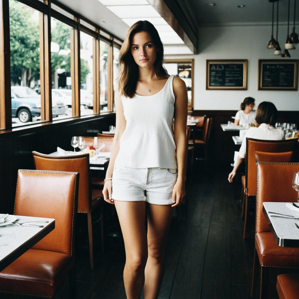 A woman stands confidently in a stylish, modern restaurant wearing a casual white tank top and white shorts, embodying a chic and relaxed summer lunch outfit. The natural light from large windows highlights the warm tones of the interior, creating a welcoming and elegant dining atmosphere.