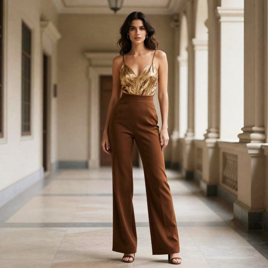 A stylish woman stands confidently in a classic architectural hallway, wearing high-waisted brown palazzo trousers paired with a shimmering gold sleeveless top. The outfit combines elegance and modern fashion, highlighting the fluid silhouette of the wide-legged pants and the luxurious texture of the top.
