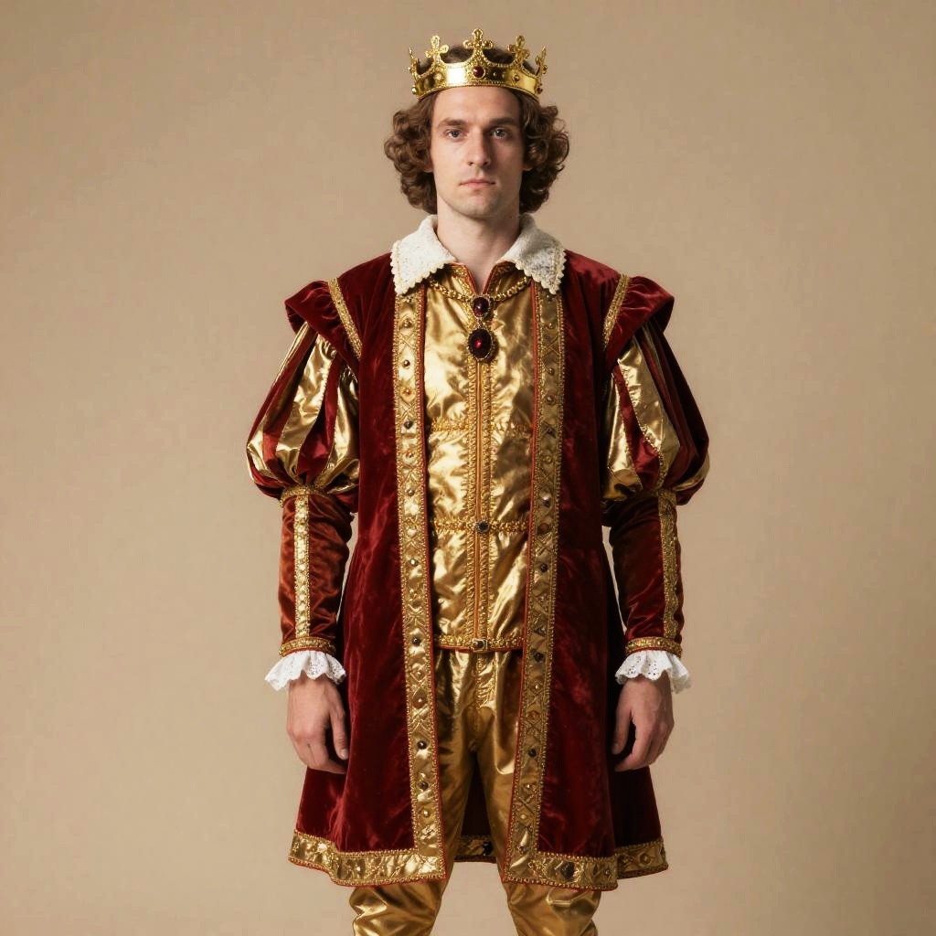 A man dressed in an elaborate Renaissance prince costume featuring rich red velvet and gold fabric, adorned with intricate trim and lace cuffs. He wears a golden crown and stands against a plain beige background, embodying the regal style of the Renaissance period.
