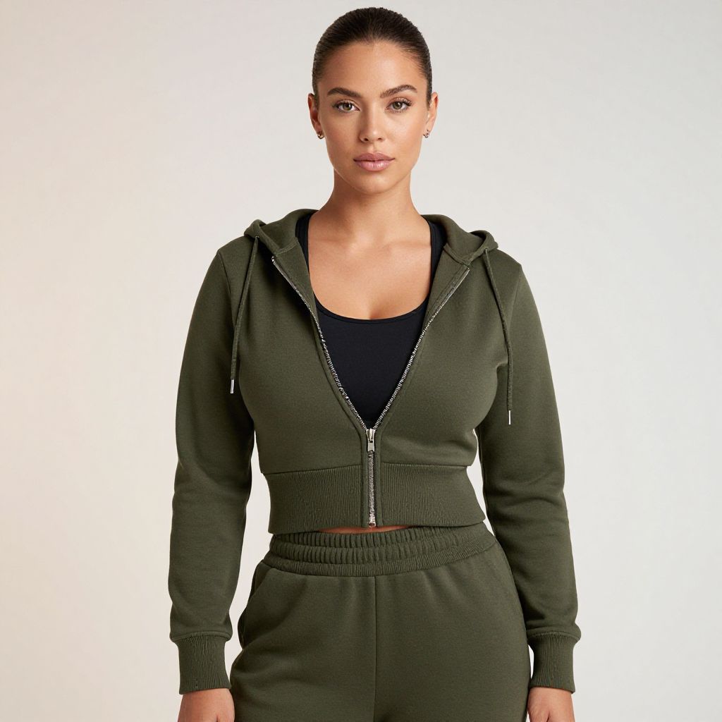 A confident woman models a stylish olive green cropped zip-up hoodie paired with matching high-waisted sweatpants, layered over a black sports bra. The casual and comfortable athleisure outfit highlights a modern, minimalistic style against a simple neutral background.