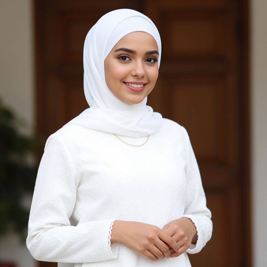 A young woman wearing a white hijab and a textured white dress stands confidently in front of a blurred wooden door. She smiles warmly, radiating a serene and elegant presence in a natural light setting.