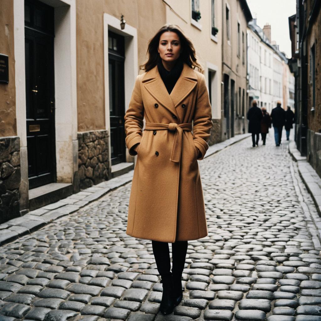 A woman confidently walks along a cobblestone street wearing a stylish camel hair coat with a belt tied at the waist. The classic double-breasted design and warm tan color highlight a timeless fall or winter fashion look in an urban setting.
