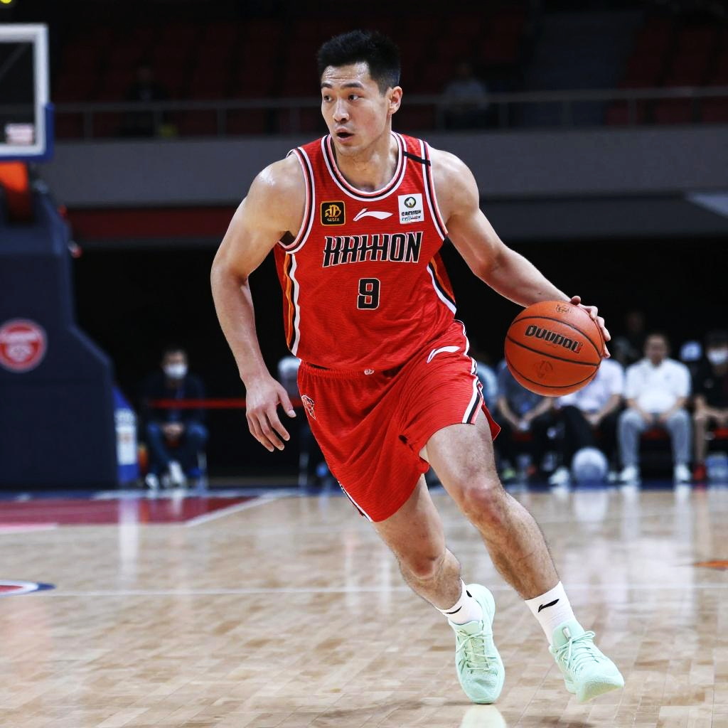 A male basketball player wearing a red uniform with the number 9 is actively dribbling the ball down the court during a game. The image captures his focused expression and athletic stance in a well-lit indoor basketball arena.
