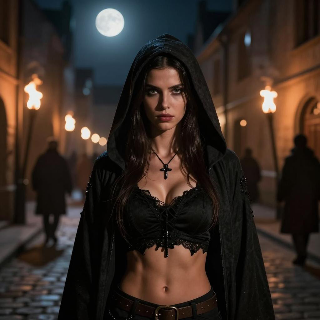 A mysterious, muscular woman stands confidently in a dimly lit cobblestone street at night, wearing a black hooded cloak over a lace crop top that reveals her toned abs. The full moon and torchlit surroundings add a gothic, dramatic atmosphere to the close-up portrait.