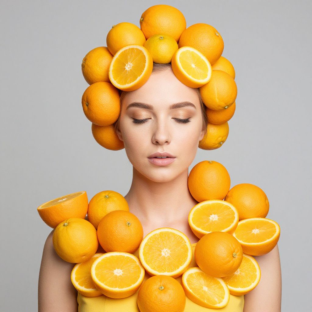 A woman with flawless makeup poses with her eyes closed, adorned with an artistic arrangement of whole and sliced oranges on her head and shoulders. The image showcases a vibrant and surreal composition blending natural elements with fashion in a creative studio setting.