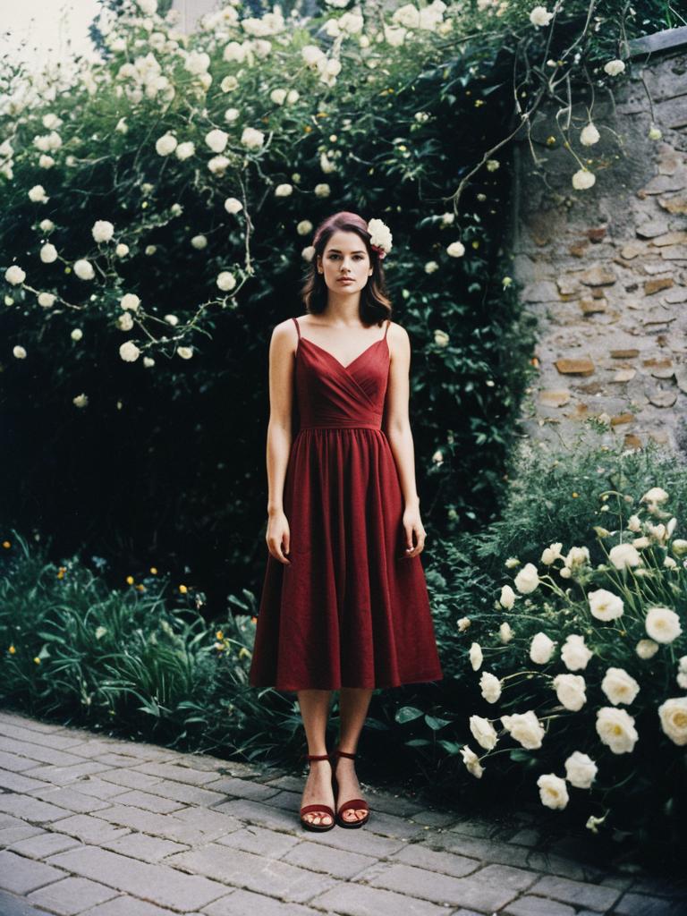 Woman in Burgundy Dress and Sandals Surrounded by White Flowers in Garden