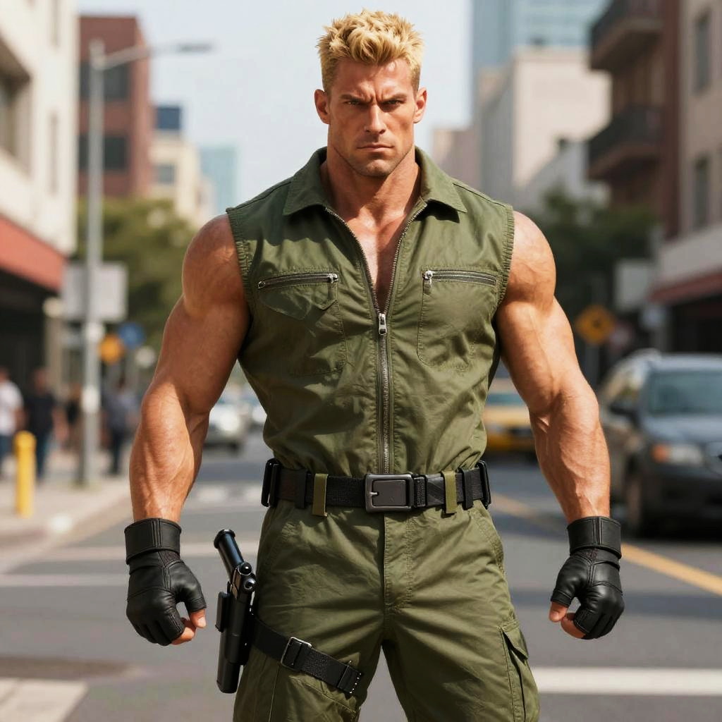 A muscular man with blond hair stands confidently in the middle of an urban street, wearing a sleeveless olive green jumpsuit and fingerless black gloves. His intense expression and tactical gear, including a holstered pistol, highlight a strong and action-ready presence.