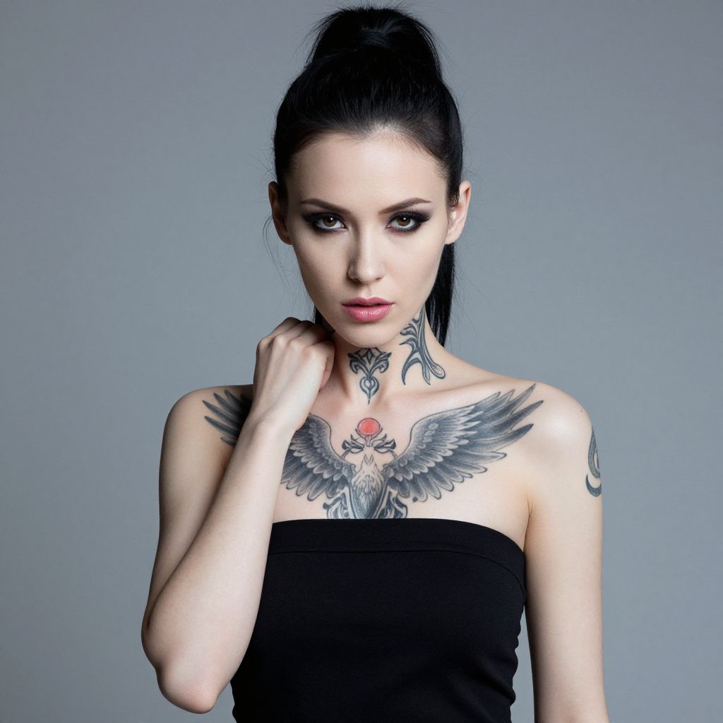 A striking woman with dark hair tied back poses against a neutral gray background, showcasing intricate tattoos on her chest, neck, and arm. She wears a black strapless top, emphasizing the detailed tattoo of a winged creature with a red orb on her upper chest, blending modern portrait photography with an edgy, alternative style.