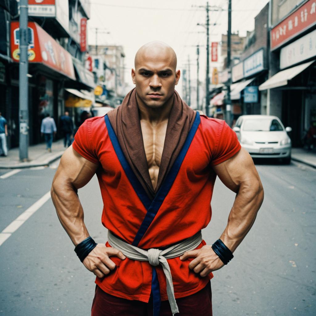 A muscular man dressed in a red Shirt and brown scarf stands confidently in the middle of an urban street, embodying the style of Sagat from Street Fighter. His strong, intense stance and detailed costume highlight a blend of martial arts and street fashion in a dynamic city environment.