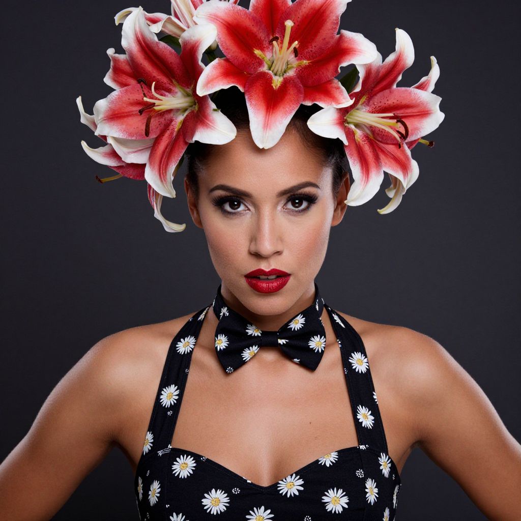 A confident woman poses against a dark background wearing a black dress with white daisy prints and a matching bow tie. She sports bold red lipstick and a striking headpiece made of large red and white lilies, creating a dramatic and elegant floral fashion statement.