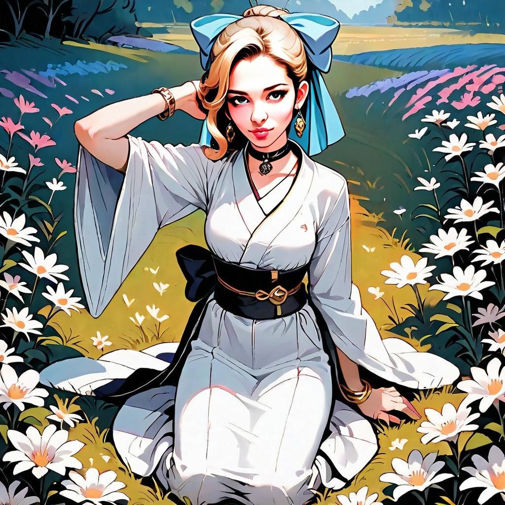 A stylish woman dressed in a modern kimono-inspired outfit sits gracefully amidst a vibrant field of white daisies. Her hair is adorned with a large blue bow, and the image features a vivid, anime-style illustration with bold colors and smooth shading.