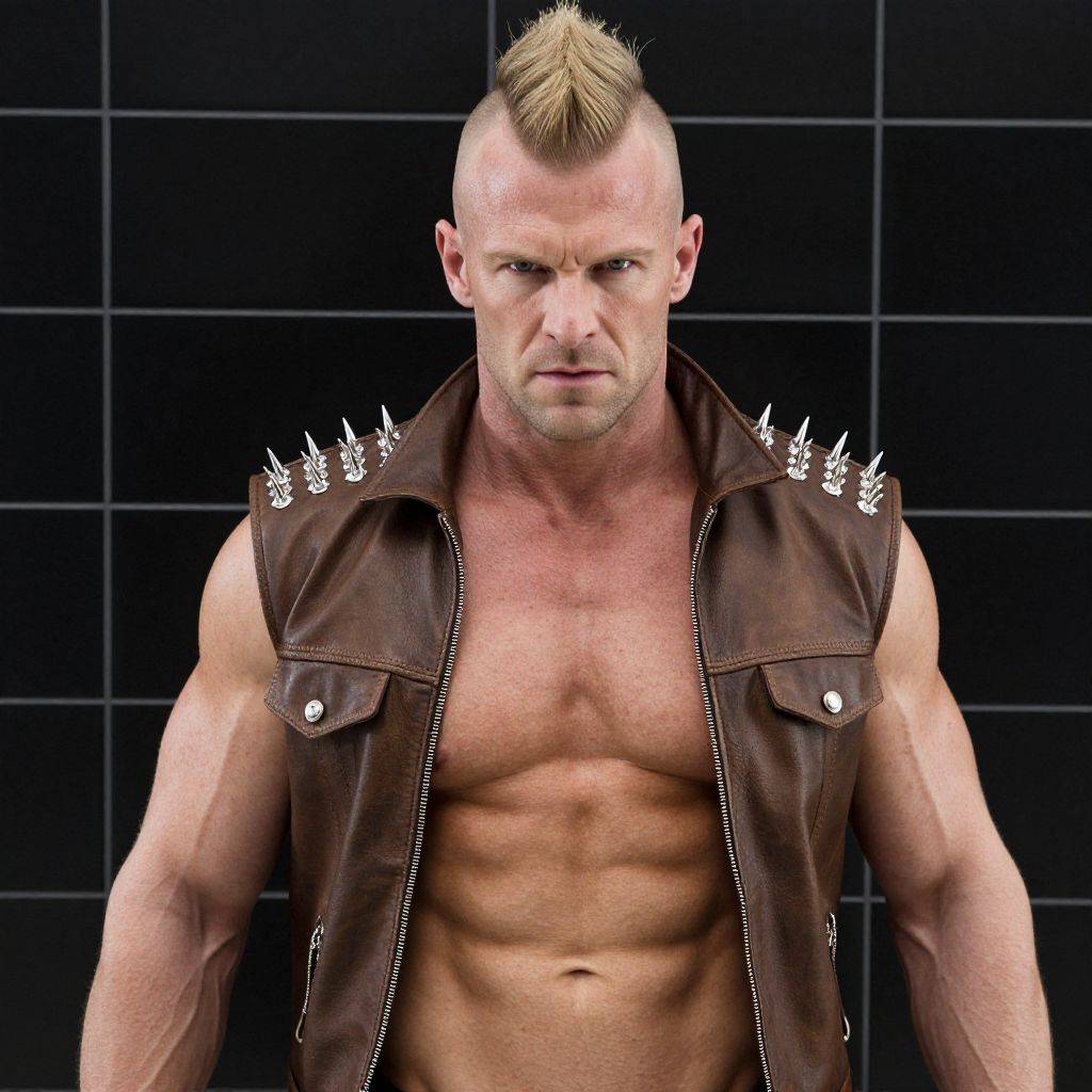 A muscular man with a fierce expression stands confidently against a tiled black wall. He sports a distinctive mohawk hairstyle and wears a sleeveless brown leather vest adorned with metal spikes on the shoulders, showcasing a tough and rebellious style.