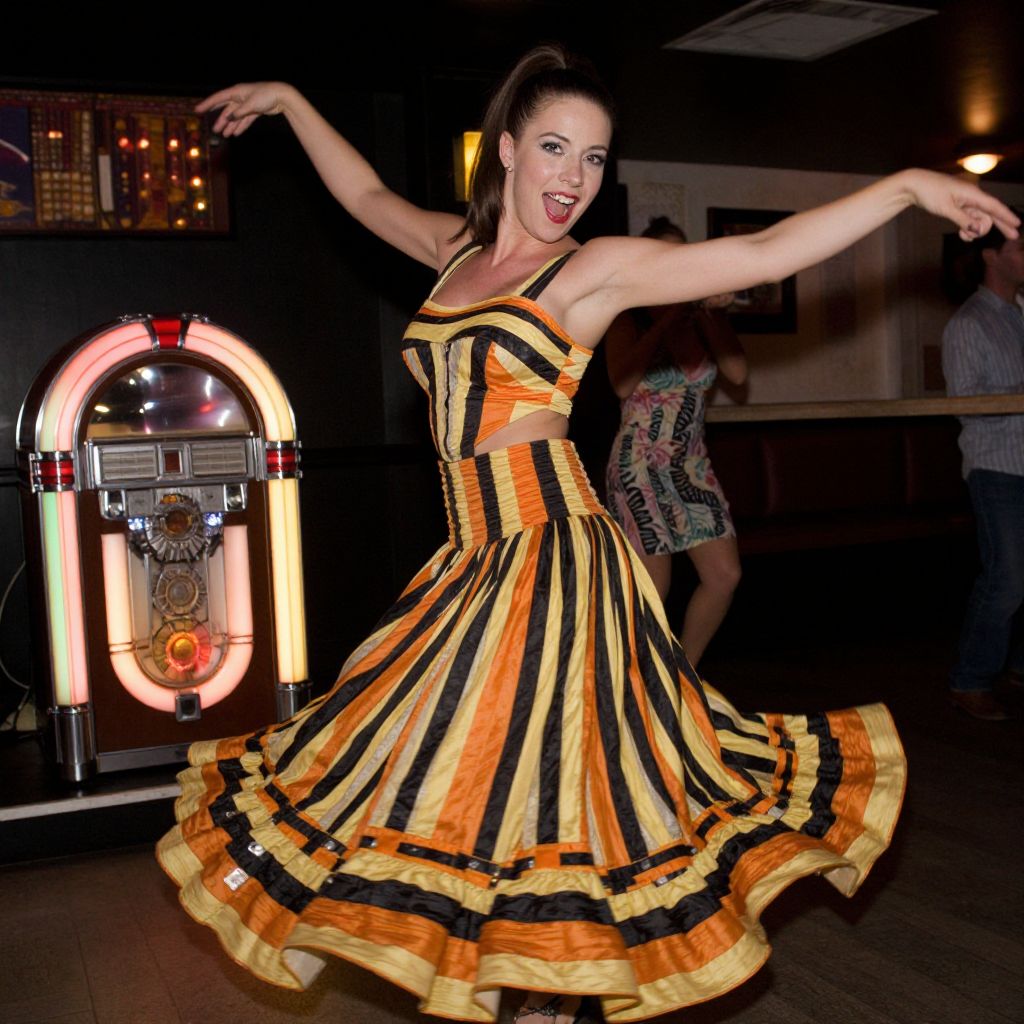 A joyful woman dances energetically in a colorful vintage-style dress with bold orange, yellow, and black stripes, reminiscent of retro fashion. She spins gracefully beside a classic illuminated jukebox in a lively indoor setting, capturing the vibrant spirit of a retro-themed party.