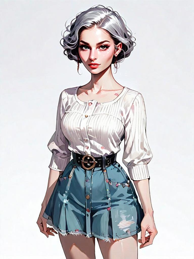 This digital artwork features a striking woman with silver hair styled in loose curls, dressed in a casual yet fashionable outfit consisting of a white buttoned blouse and a high-waisted denim skirt with a black belt. The illustration showcases a realistic comic style with detailed shading and smooth line work, emphasizing the character's confident expression and modern look.