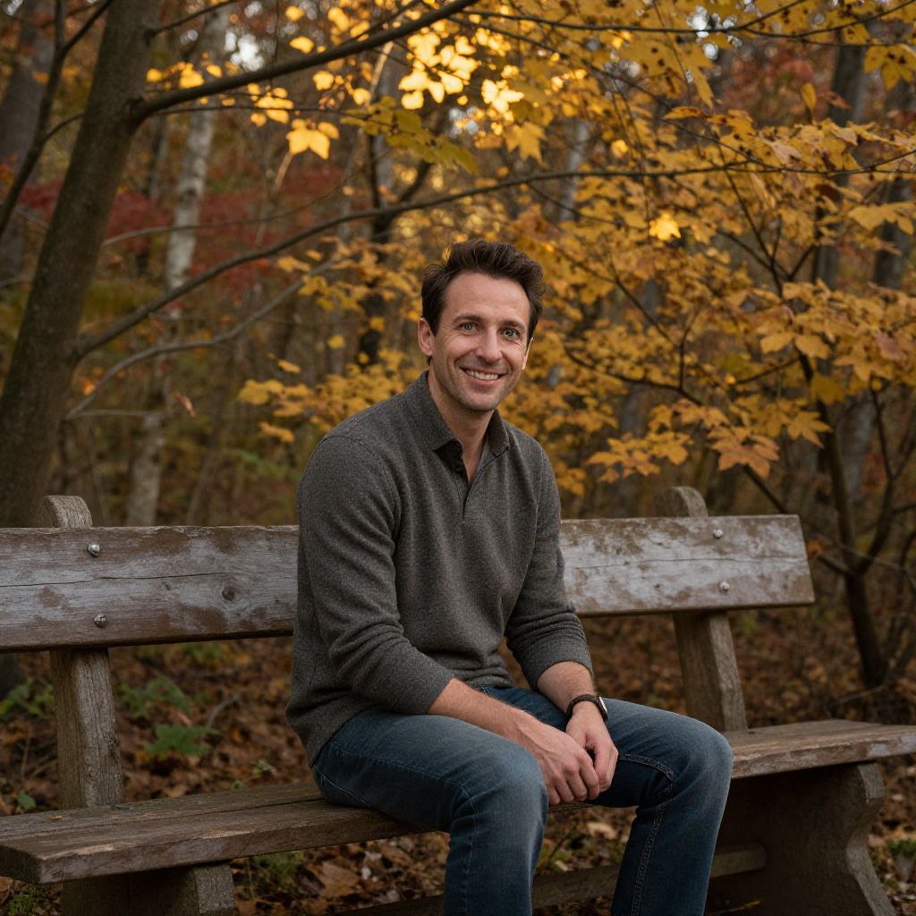 A man with a pleasant smile is sitting on a rustic wooden bench in a forest during autumn. The background features trees with vibrant yellow and orange leaves, showcasing the warm, natural colors of the fall season.