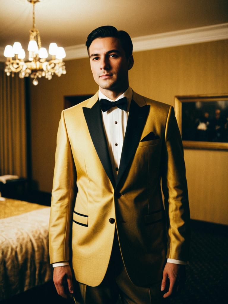 Groom in Gold Evening Wear Tuxedo with Bow Tie Standing Indoors