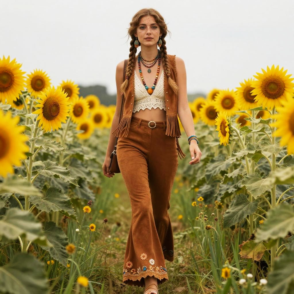 A young woman dressed in a bohemian outfit walks confidently through a vibrant sunflower field. Her outfit includes a crocheted crop top, brown fringed vest, and flared pants adorned with floral embroidery, capturing a nostalgic 1970s hippie style.