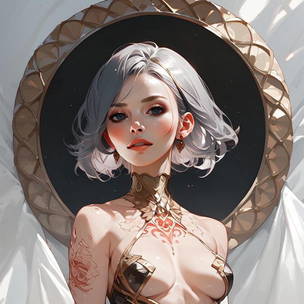 This digital artwork features a striking woman with short silver hair and intricate tattoos on her chest and shoulder, rendered in a detailed anime-inspired style. She is framed against a decorative circular background that enhances her elegant and confident presence, showcasing a blend of fantasy and sci-fi elements.