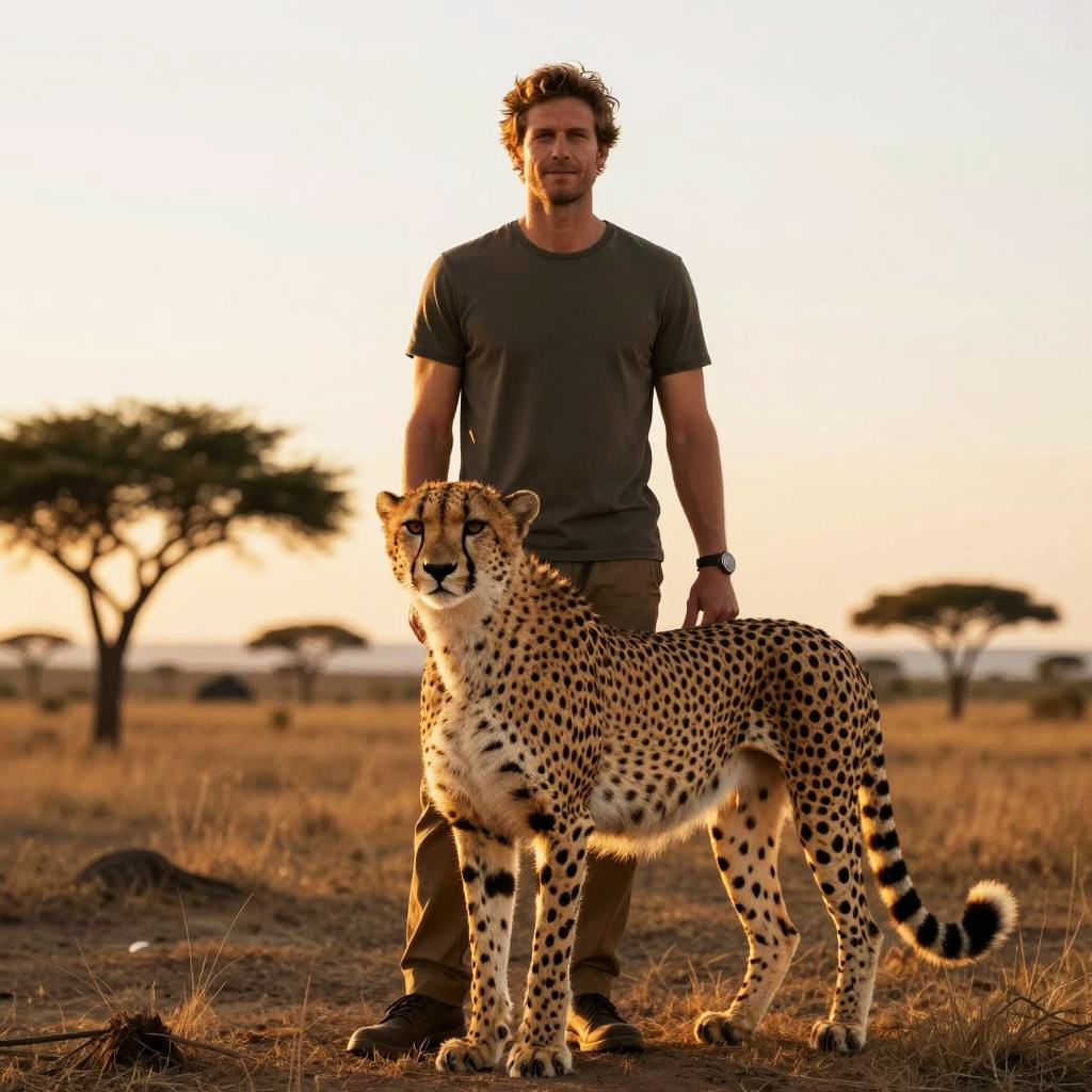 A man stands confidently in an African savanna landscape during golden hour alongside a majestic cheetah. The warm natural light highlights the intricate patterns of the cheetah's fur and the serene environment around them. This image captures a unique moment of human and wildlife connection in nature.