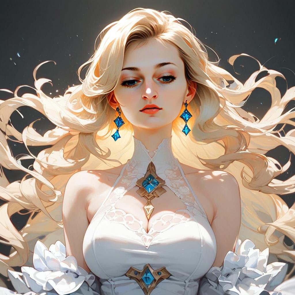 This digital artwork features a stunning woman with long, flowing blonde hair and striking blue eyes, adorned with intricate blue gemstone earrings and a matching pendant. Rendered in a detailed anime-inspired style, the character exudes an ethereal and elegant aura with soft lighting enhancing her delicate features and ornate white attire.
