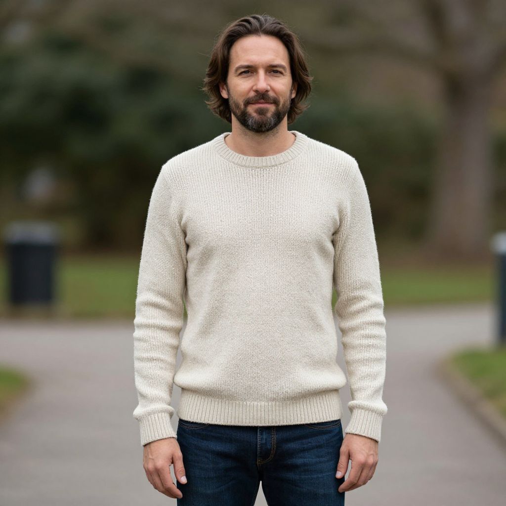 A confident man with medium-length brown hair and a beard stands outdoors on a pathway, wearing a cozy off-white knit sweater and dark blue jeans. The background is softly blurred, highlighting the subject in a natural setting with muted, earthy tones. The image conveys a relaxed and approachable vibe with a modern casual style.