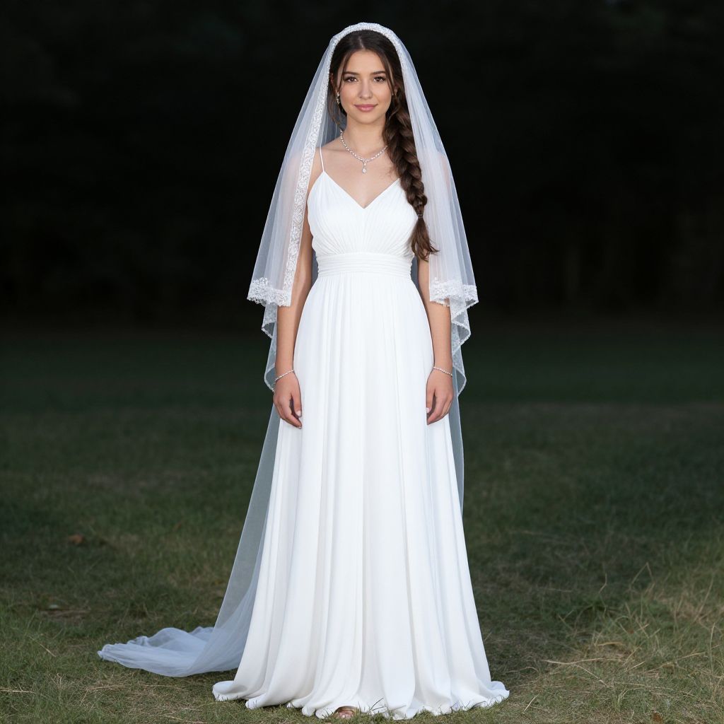 A young woman stands outdoors wearing a classic white wedding dress with a fitted bodice and flowing skirt. She complements her bridal look with a delicate lace-edged veil and a simple braided hairstyle, set against a dark, blurred natural background.