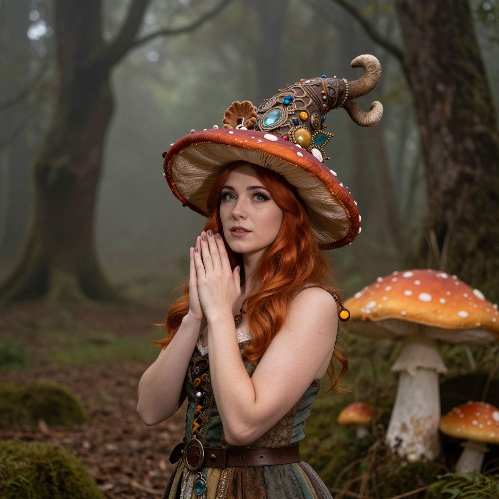 A woman with long red hair wearing an elaborate, whimsical mushroom-shaped witch hat adorned with colorful gemstones stands in a misty forest. She is dressed in a fantasy-style outfit, evoking a magical and enchanting atmosphere with large toadstools visible in the blurred background. The image captures a fairytale or fantasy aesthetic with intricate costume details and a mystical woodland setting.
