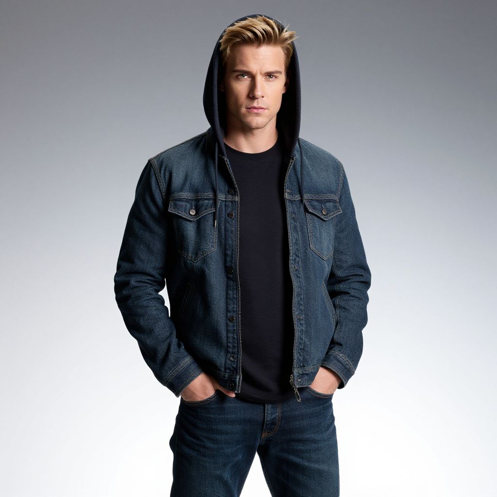 Young Man in Denim Jacket and Hoodie Casual Fashion Portrait