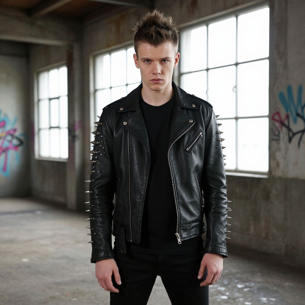 A young man stands confidently in an industrial, graffiti-covered warehouse wearing a black leather jacket adorned with metal spikes on the sleeves. His spiky hairstyle and intense expression complement the edgy punk rock fashion style. The natural light from the large windows highlights the gritty urban setting.
