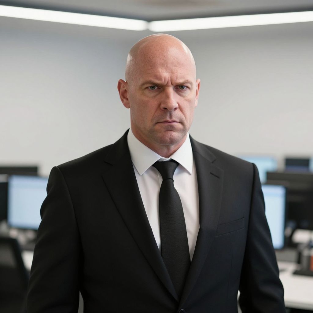 A stern-looking bald man in a black suit and tie stands confidently in a modern office environment, with computer monitors softly blurred in the background. The image conveys a serious business or corporate atmosphere with a focus on professionalism and authority.