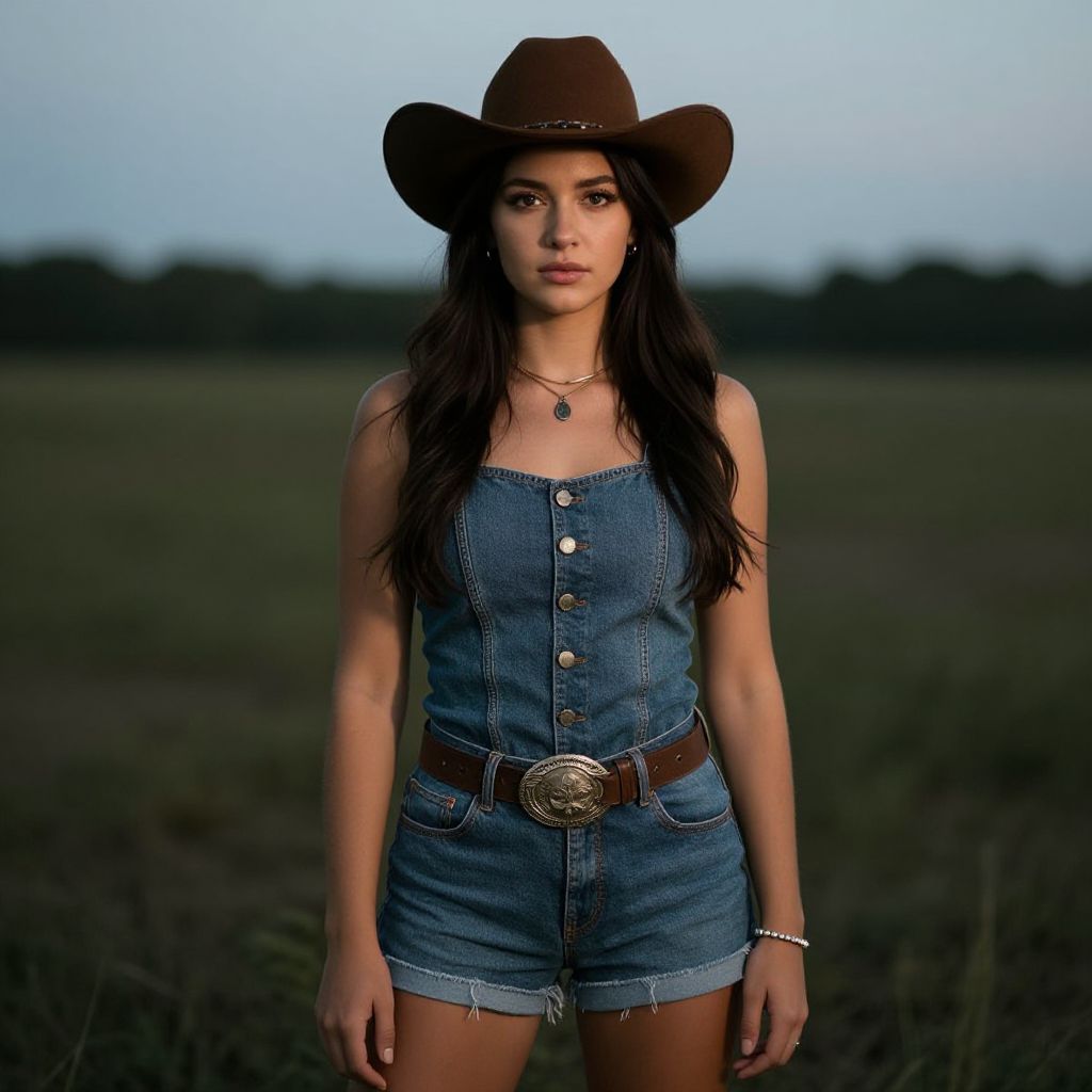 A young woman stands confidently in an open field wearing a brown cowboy hat and a denim button-up romper with a decorative belt. The soft natural lighting and blurred background highlight her focused expression and western-inspired outfit, evoking a modern country style.
