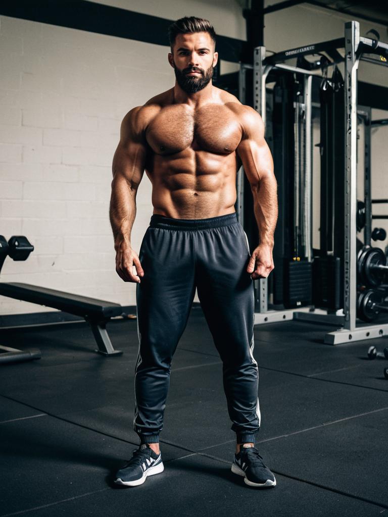 A muscular man stands confidently in a gym setting wearing black workout pants, showcasing his well-defined physique and facial hair. The image highlights strength and fitness, with gym equipment visible in the background under warm lighting.