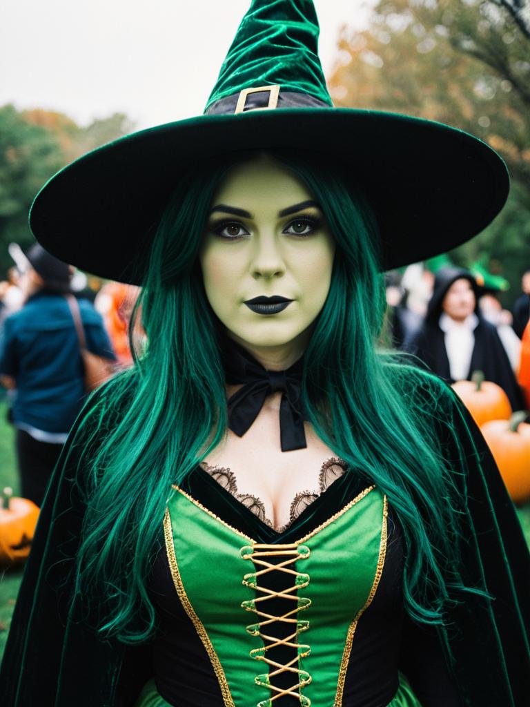 A woman dressed in a striking green witch costume poses candidly at a Halloween event. Her outfit features a velvet green hat and cape, complemented by dark makeup and long emerald hair, embodying classic witch cosplay style in an outdoor festive setting.
