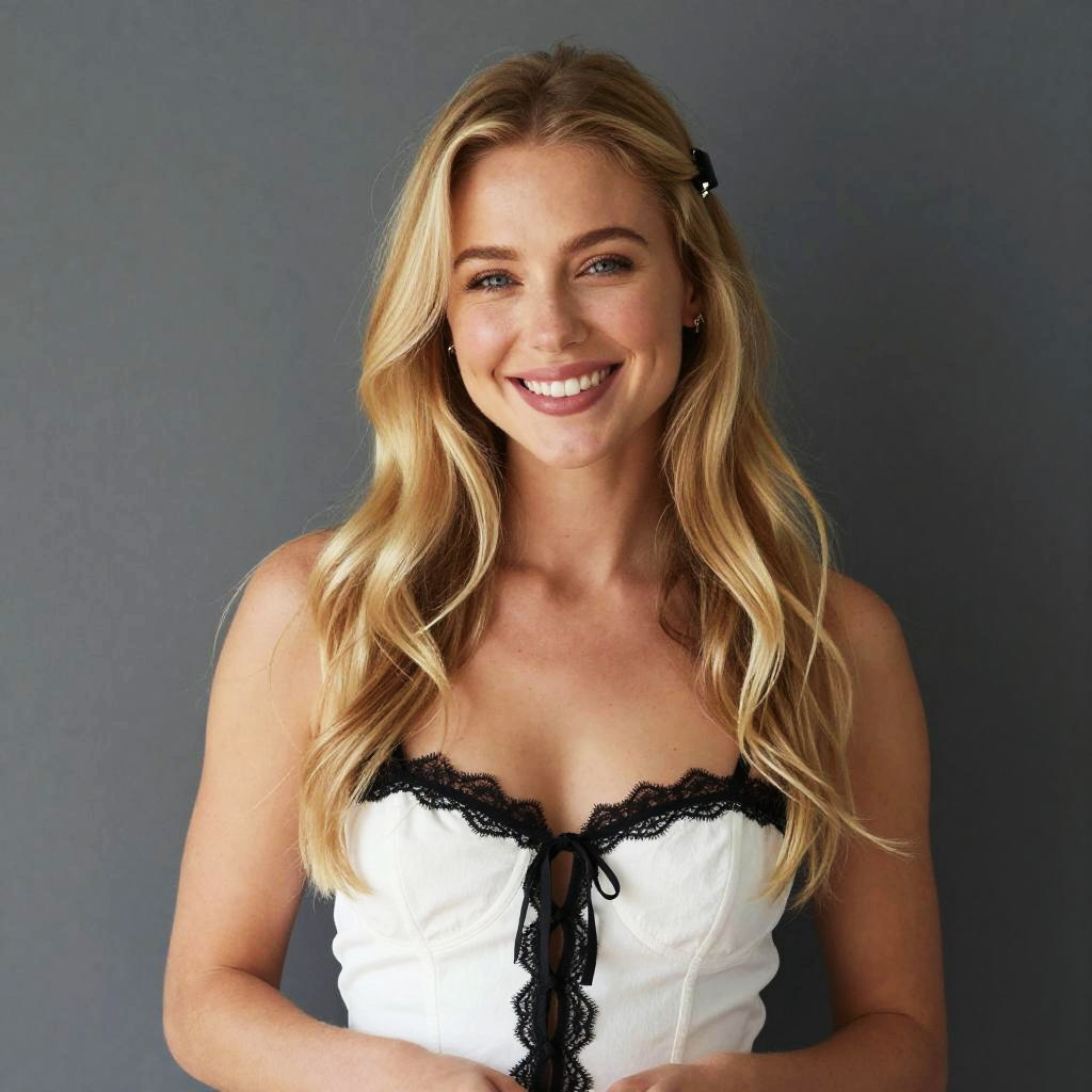 A smiling young woman with long blonde hair styled in loose waves poses against a simple grey backdrop. She is wearing a white corset-style top with black lace trim and looks directly at the camera with a warm and friendly expression.